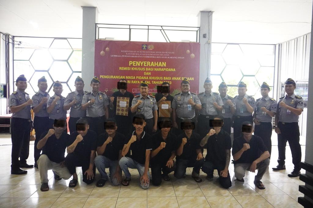Link,Martapura – Sembilan Warga Binaan Lembaga Pemasyarakatan (Lapas) Narkotika Kelas IIA Karang Intan beragama Kristen dan Katolik menerima Remisi Khusus (RK) Natal 2023. Surat Keputusan diserahkan simbolis oleh Kepala Lapas Narkotika Karang Intan, Wahyu Susetyo, di Aula Ruang Kunjungan, Senin (25/12/2023) pagi.