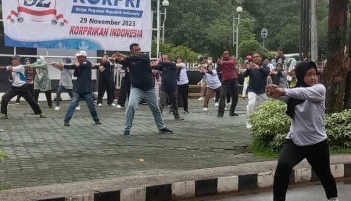Link, Martapura – Memperingati Hari Ulang Tahun (HUT) ke 52 Korps Pegawai Republik Indonesia (KORPRI) Tahun 2023, Pengurus KORPRI Kabupaten Banjar menggelar senam sehat.