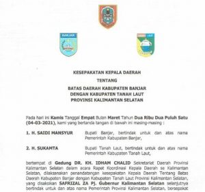Di mana dokumen tersebut ditandatangani di Gedung DR. KH. IDHAM CHALID Sekretariat Daerah Provinsi Kalimantan Selatan antara H. Saidi Mansyur, Bupati Banjar, bertindak untuk dan atas nama Pemerintah Kabupaten Banjar dan H. Sukamto, Bupati Tanah Laut, bertindak untuk dan atas nama Pemerintah Kabupaten Tanah Laut tersebut dan disaksikan, Safrizal ZA Pj. Gubernur Kalimantan Selatan.