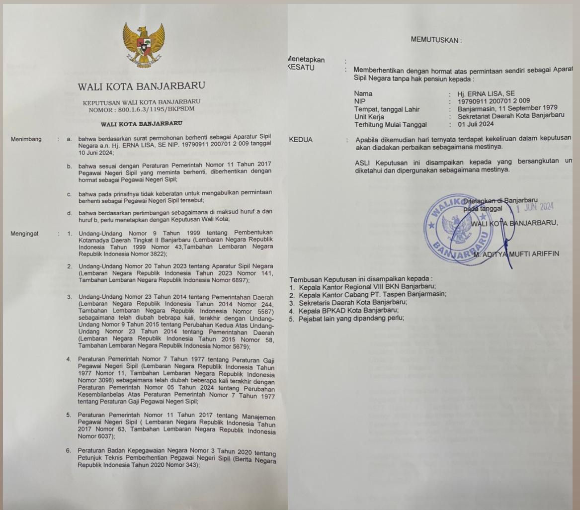 Dalam surat KEPUTUSAN WALI KOTA BANJARBARU NOMOR: 800.1.6.3/1195/BKPSDM antara lain memutuskan Memberhentikan dengan hormat atas permintaan sendiri sebagai Aparat Sipil Negara tanpa hak pensiun Atas Nama Hj. ERNA LISA, SE NIP. 19790911 200701 2 009 tanggal 10 Juni 2024. Selain itu juga disebutkan, SK tersebut berlaku sejak 01 Juli 2024.