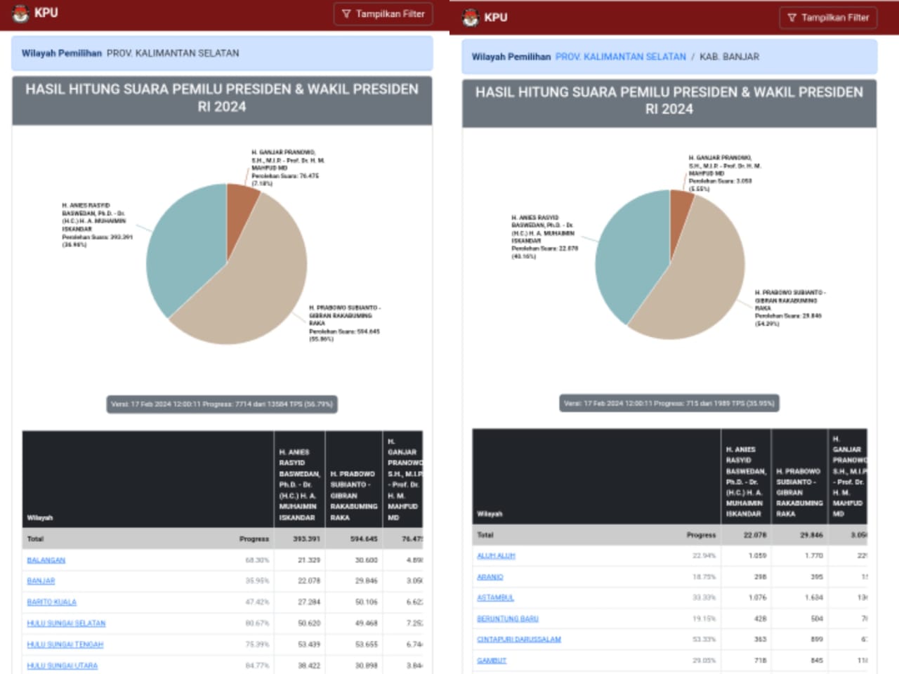 Bahkan, Capres dan Cawapres Prabowo – Gibran juga mengungguli kedua Paslon lainnya di wilayah Provinsi Kalimantan (Kalsel) di 7714 TPS dari total 13584 TPS (56.79%) di 13 kabupaten/kota, yakni sebanyak 594.645 suara atau sekitar 55.86 persen, dan Paslon nomor urut 1 sebanyak 393.391 suara atau sekitar 36.96 persen, sedangkan Paslon nomor urut 3 sebanyak 76.475 suara atau sekitar 7.18 persen.