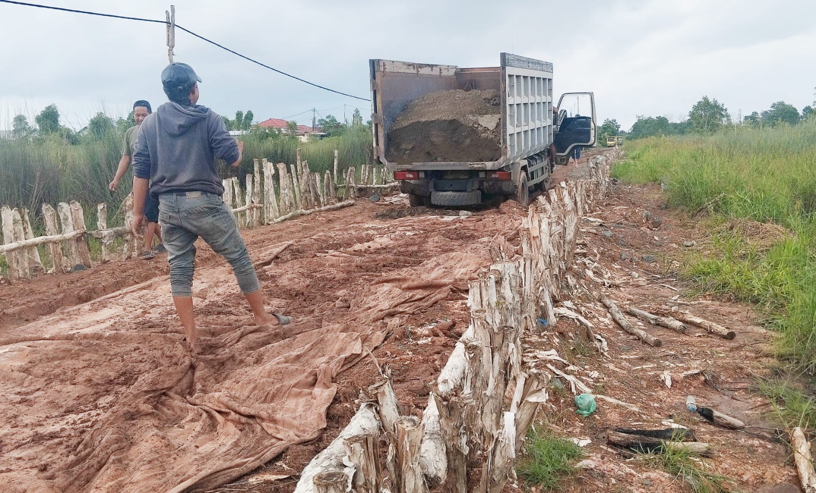 “Kalau sesuai site plan kita hanya melakukan land clearing, pengerukan, urugan tanah, pondasi cerucuk kayu galam, dan pasangan dinding batu, serta geotextile saja. Dan memang untuk pasangan dinding batu baru terlaksana sekitar 40 persen,” katanya.