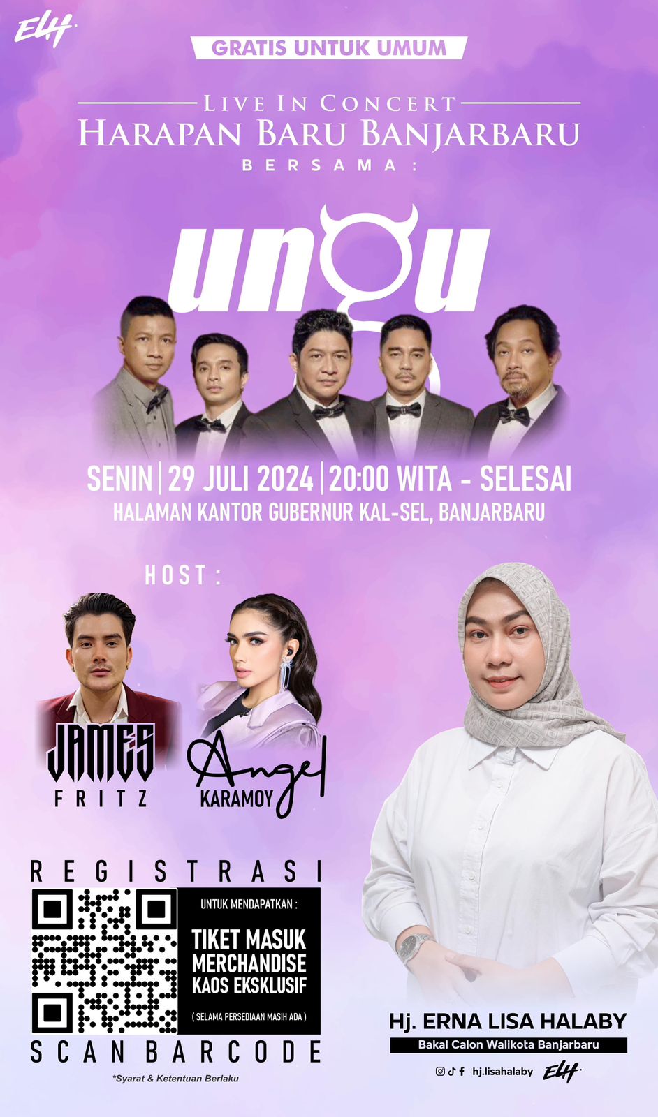 Link, Banjarbaru – Pencinta grup Band Ungu sudah dapat menukarkan tiket dan merchandise mulai hari ini, Minggu 28 Juli 2024 sejak pukul 12.00 – 22.00 WITA, di lapangan kantor Gubernur Kalimantan Selatan di Banjarbaru.