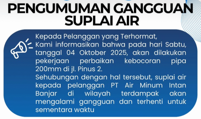 Link, Banjarbaru – Suplai Air kepada pelanggan PTAM Intan Banjar, akan mengalami gangguan dan terhenti sementara, pada 4 Oktober 2025. Dikarenakan adanya perbaikan kebocoran pipa 200mm di jl. Pinus 2.