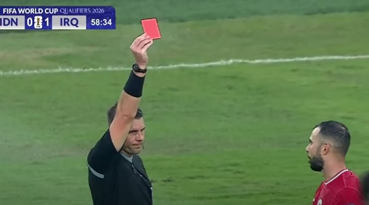 Tertinggal 1-0, Timnas Indonesia mencoba bangkit. Namun usaha Skuat Garuda itu semakin sulit, karena di menit ke-59 Jordi Amat membuat pelanggaran keras terhadap pemain Irak tepat di luar kotak penalti, dan wasit langsung memberikan kartu merah langsung.