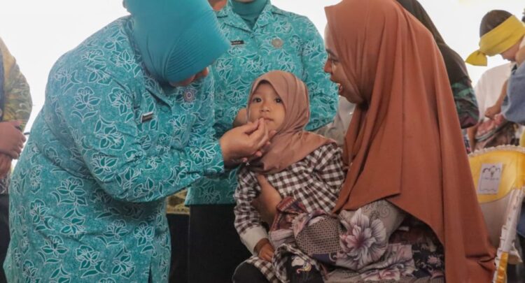 Link, Barabai – Ketua TP PKK Provinsi Kalimantan Selatan yang juga Kepala Dinas Kesehatan Provinsi Kalsel, Hj. Raudatul Jannah meneteskan vitamin A biru dan Vitamin A merah, kepada perwakilan anak yang berusia di bawah 1 tahun dan diatas 1 tahun.