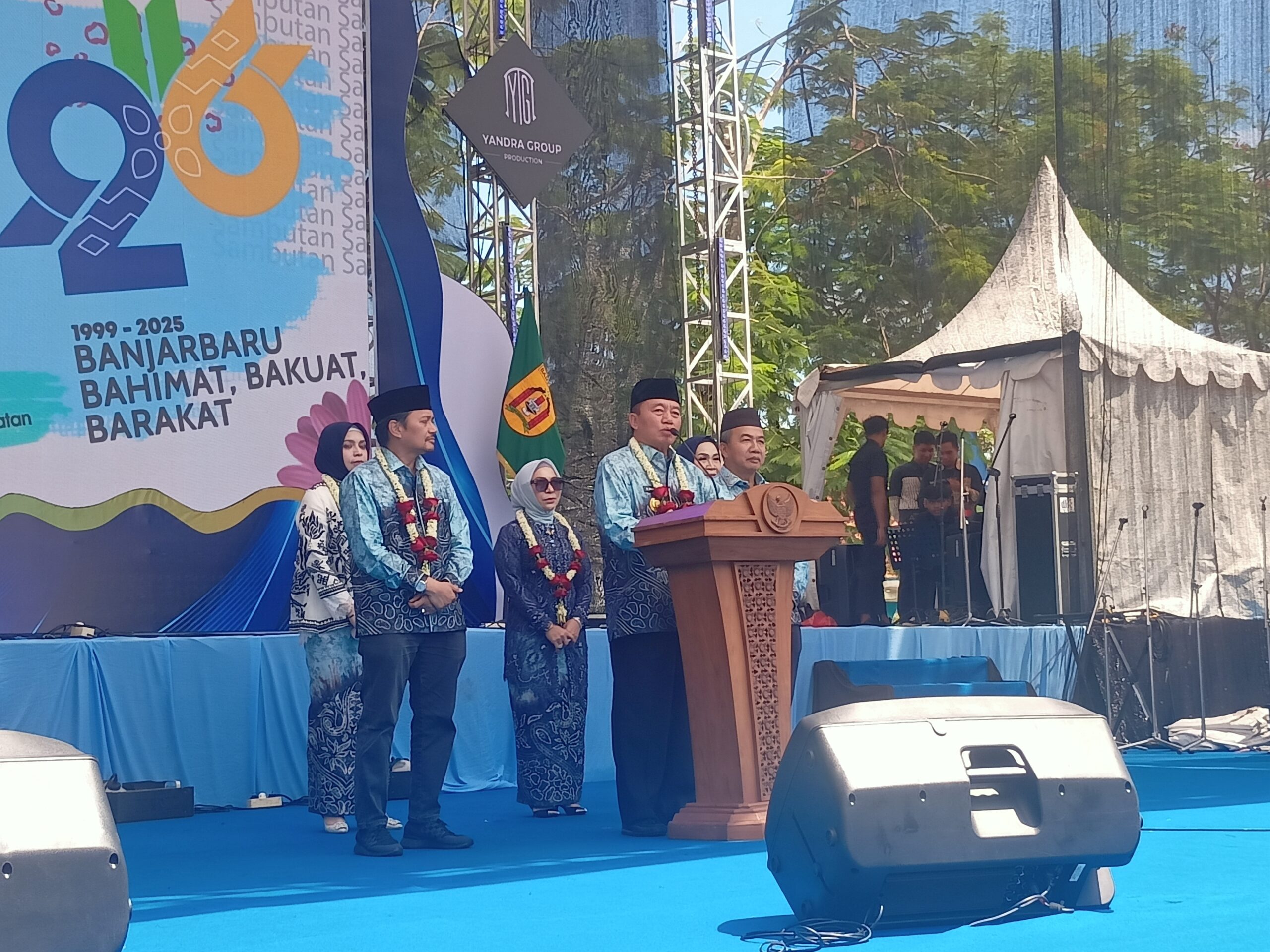 Link, Banjarbaru – Momen peringatan puncak Hari Jadi ke 26 Kota Banjarbaru, Gubernur Kalsel H Muhidin menunjukkan keharmonisannya bersama Wakil Gubernur Hasnuryadi Sulaiman dan Pj Sekdaprov Muhammad Syarifuddin yang ia disebut “Tiga Serangkai”. Ini, ditunjukkan saat Ia akan memberikan sambutan dihadapan tamu undangan termasuk seluruh Kepala Daerah se Kalsel, pada Sabtu (26/04/2025) di Lapangan dr Murdjani.