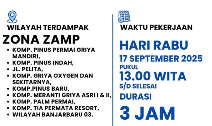 Link, Banjarbaru – Proyek drainase yang dikerjakan Pemerintah Kota Banjarbaru, juga berdampak pada pendistribusian air bersih di Zona ZAMP. Pasalnya, pada 17 September 2025 akan dilakukan pergeseran pipa distribusi di zona tersebut.